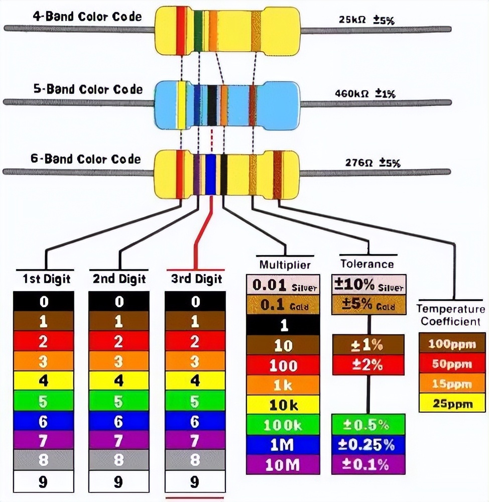 From left to right, the first two or three rings represent the number, the next rings represent the multiplier, and the multiplication of the previous numbers is the resistance value. The next ring represents the tolerance of the resistance, and finally the temperature coefficient of the resistance.