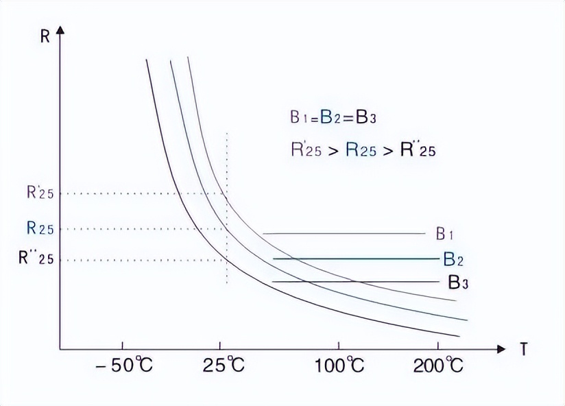 As shown below, there are three thermistors with the same B value, but their resistance values are different. It can be seen that the B value is only a certain range of parameters for each thermistor, it only reflects part of the characteristics of the thermistor, and is not a rigorous parameter, in practical applications, the need to provide resistance table within the detection temperature range is the correct approach.